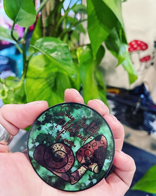 Approximately 2.5 inches Sorry Im late Snail Mushroom Ice Dye vinyl sticker - retail swag